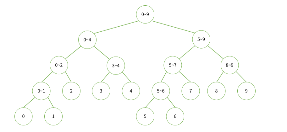 즉, 세그먼트 트리에는 특정 구간 배열의 합들을 노드에 저장해 놓는 형태인 것이다. 예를 들어 배열의 크기가 10일 때 세그먼트 트리의 각 노드는 다음을 의미한다.