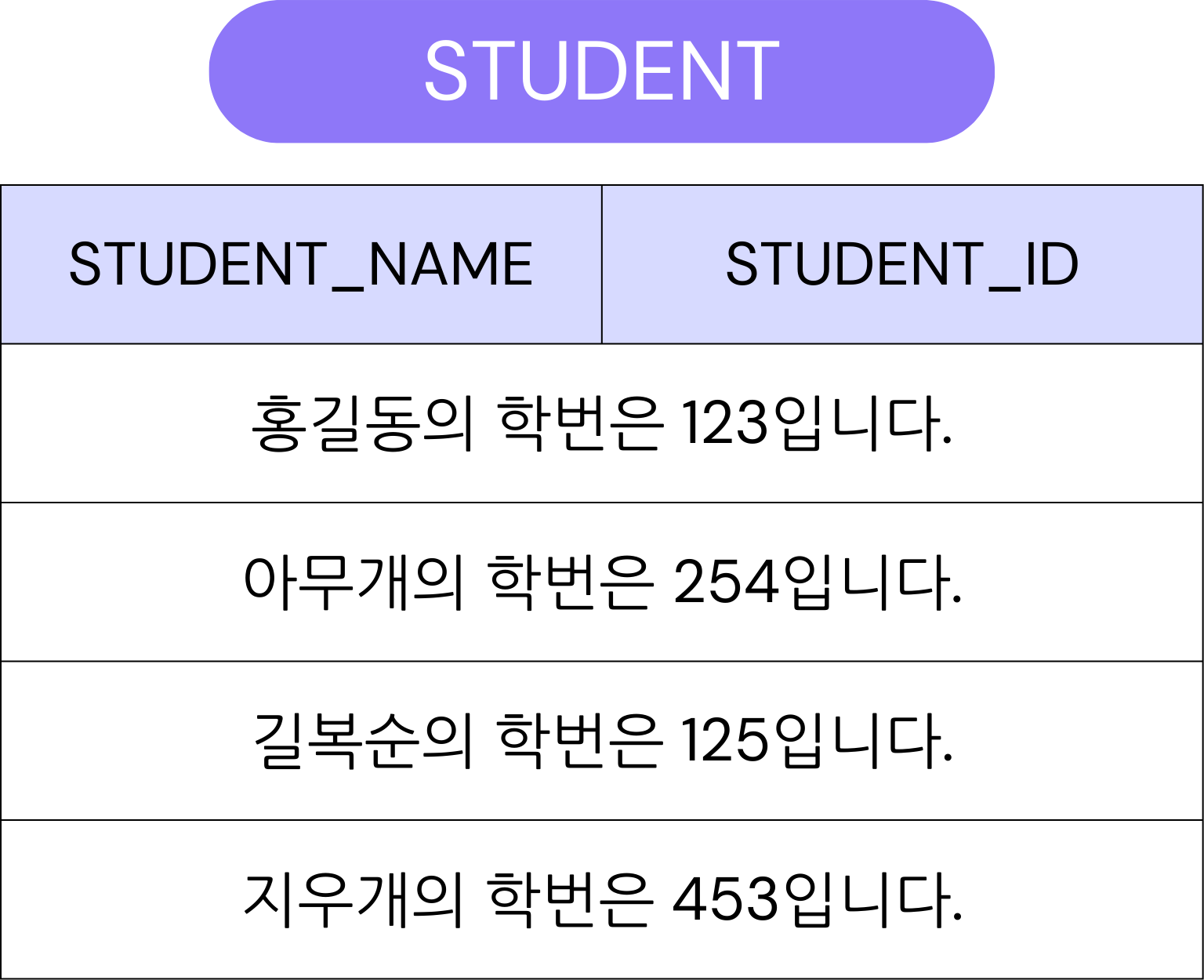 학생의 정보를 담고 있는 테이블에 학생의 이름과 학생의 학번을 조회하고 싶다고 가정할 때 "[학생]의 학번은 [학번]입니다"라는 형태로 조회를 해보자.