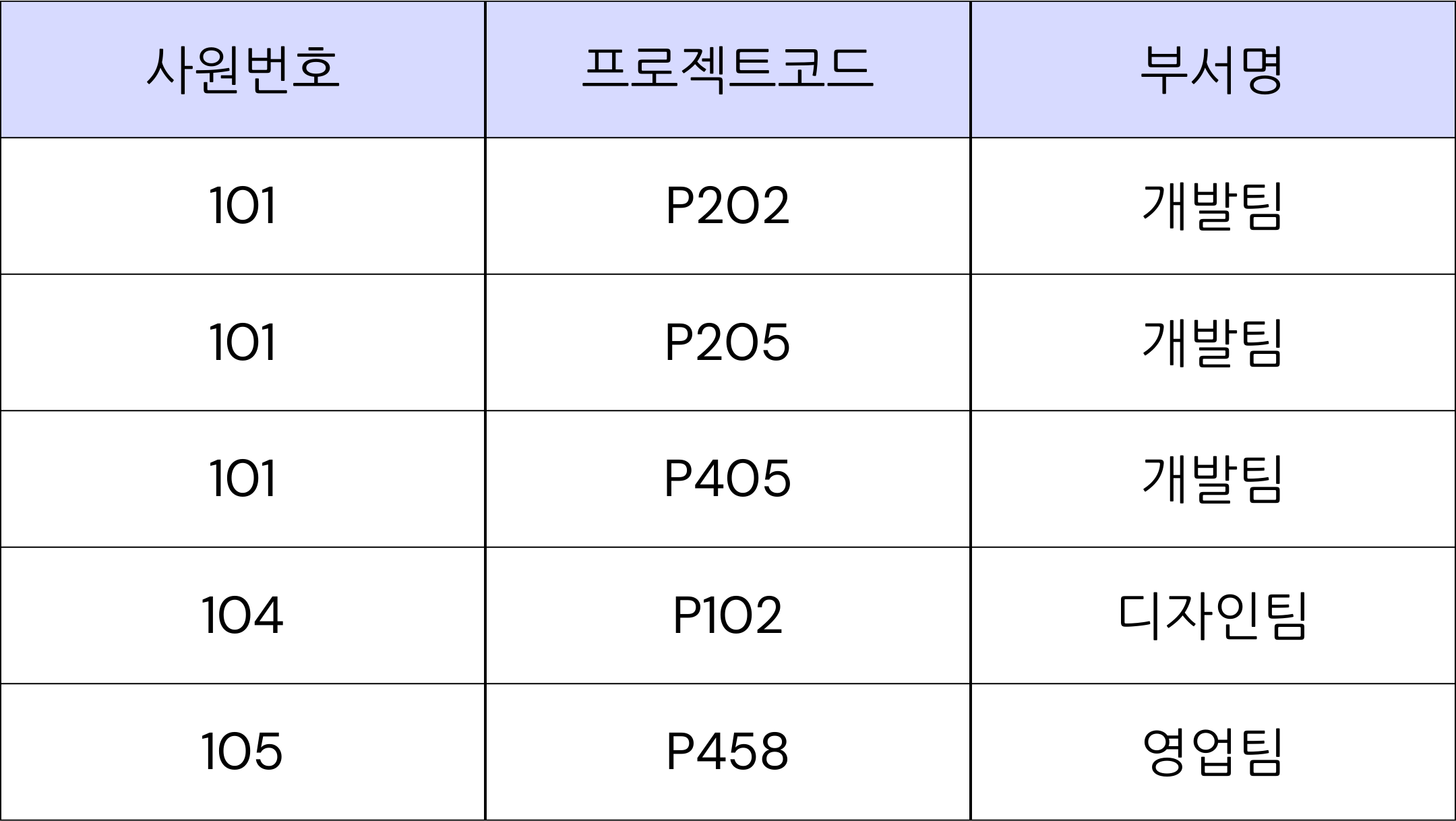 사원번호와 프로젝트 코드가 조합키로 설정되어 있고 한 사원은 하나의 부서만 가질 수 있다. 이 때 새로운 신입 사원 106이 들어왔서 데이터를 추가해야 하는데 아직 프로젝트를 배정 받지 못했기 때문에 추가할 수 없는 상황이 발생하게 되는 것이다.