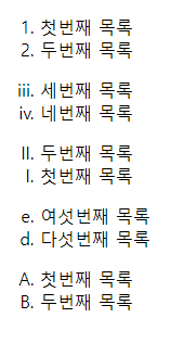 위의 속성을 사용한 예제 코드이다. list style type을 변경하기 위해서는 스타일 속성에서 지정해주어야 한다.