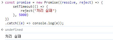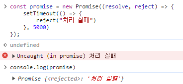 5초가 지나 reject를 통해 실패를 알리는 객체를 호출하였으므로 거부 상태로 변하게 되고, 이를 출력하니 rejected 상태가 출력되는 것을 볼 수 있다.