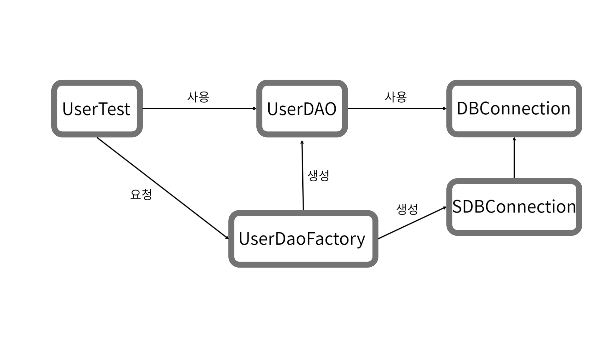 위의 그림을 토대로 코드의 흐름을 보면, 애플리케이션에서 비즈니스 로직을 담당하는 컴포넌트들은 다른 컴포넌트에 영향을 받지 않고(유연하고) 동작하는 것을 볼 수 있다. 그 사이에서 UserDaoFactory 클래스, 즉 factory 역할을 하는 컴포넌트는 비즈니스 로직을 담당하는 컴포넌트 사이의 관계를 정의하고 애플리케이션의 구조를 정의하는 역할을 하는 것을 볼 수 있다.