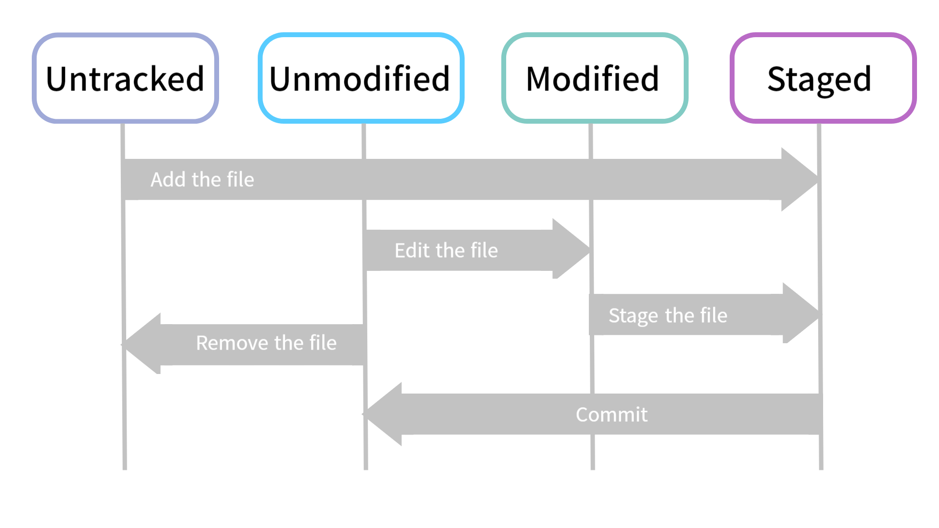 Tracked 파일은 또 Unmodified(수정되지 않음)와 Modified(수정됨) 그리고 Staged 중 하나의 상태를 가진다. 간단하게 staging area에서 커밋을 기다리는 파일이 staged, 커밋 후 수정되지 않은 파일이 unmodified, 커밋 후 수정된 파일이 modified 인 것이다.
