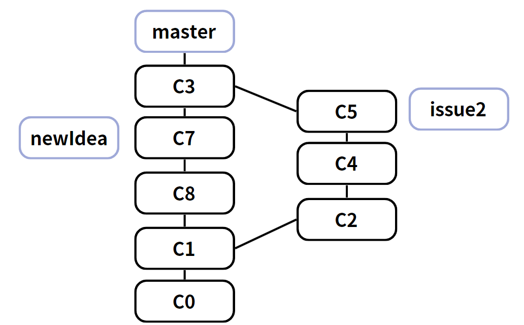 이 때, 이슈를 해결했던 방법은 issue2 branch가 선택되었고 newIdea로 개발했던 기능도 적용하기로 결정났다. 해당 사항에서 merge를 진행하게 되면 아래와 같이 merge가 진행된다.