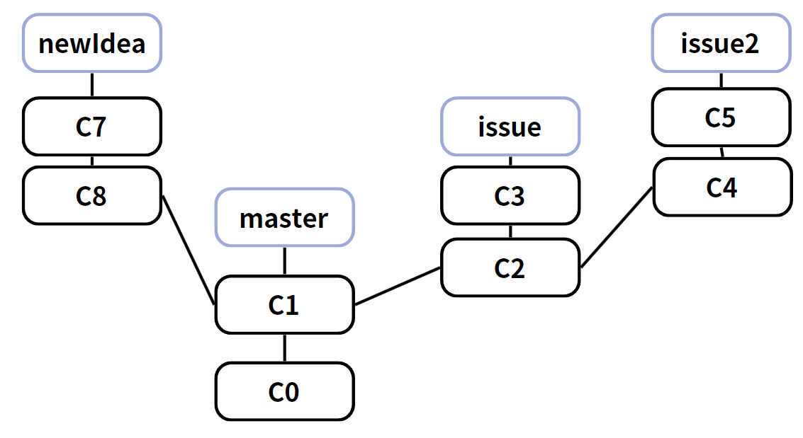 예를 들어, 하나의 상황을 가정해보자. 배포중인 master branch에서 issue가 생겨서 이를 해결하기 위한 issue branch를 생성하였다. 개발을 진행하다가 다른 방식의 해결방법이 생각나서 issue2 branch를 생성하였다. 또한 새로운 기능을 넣기 위한 newIdea branch도 생성하였다. 각가의 브랜치에서 개발을 완료했더니 다음과 같은 커밋 히스토리가 만들어졌다.
