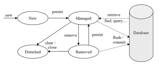| Removed(삭제) | 데이터베이스 상에서 삭제된 상태. 객체는 더 이상 영속성 컨텍스트에 존재하지 않는다. |