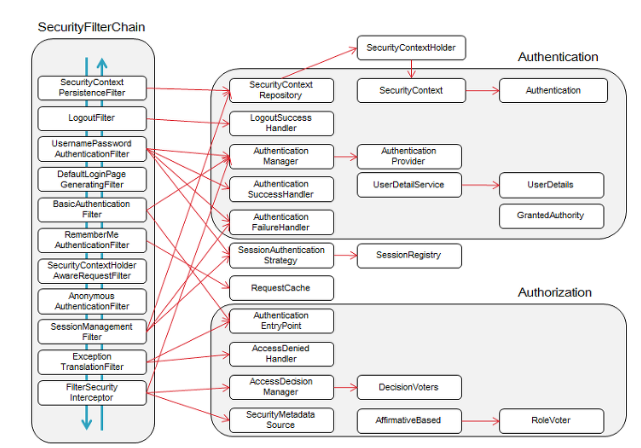 이 중에서 UsernamePasswordAuthenticationFilter 는 인증 처리를 담당하는 필터로 인증 성공 실패에 따라 AuthenticationSuccessHandler, AuthenticationFailureHandler를 호출하게 되고, 인증이 성공하면 UsernamePasswordAuthenticationToken을 세션에 저장한다. ( 추후에 외부인증을 위해 인증 처리 부분을 커스터마이징할 때, 해당 필터를 대신하는 커스텀 필터를 추가하게 된다. )