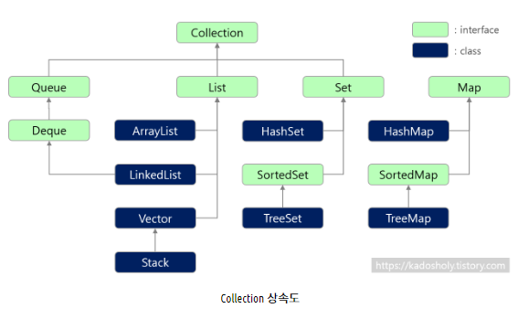 - 일괄된 API : Collection의 일관된 API를 사용하여 Collection 밑에 있는 모든 클래스(ArrayList, Vector, LinkedList 등) Collection에서 상속받아 통일된 메서드를 사용한다