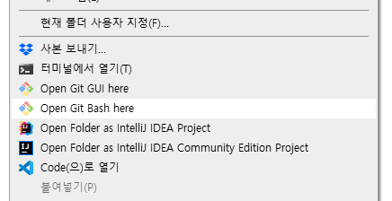 설치 후 마우스를 우클릭하여 옵션을 띄웠을 때 아래의 사진처럼 open git bash here이 뜨면 정상적으로 설치된 것이다. (해당 옵션은 기본 옵션으로, 기본 옵션으로 쭉 설치했다면 아래와 같이 뜰껏이다!!)